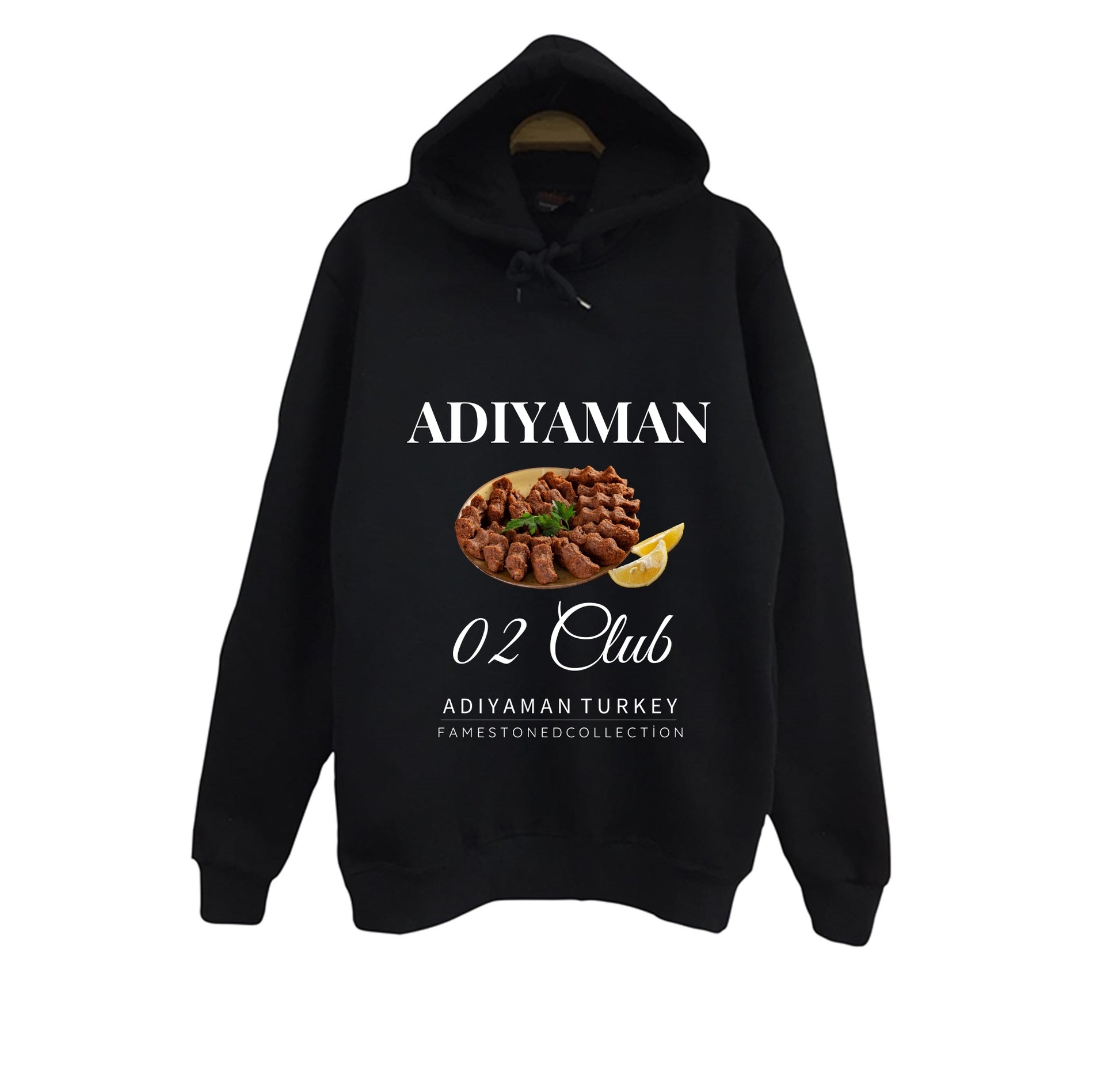 Adıyaman - 02 - Çiğköfte - Şehir Baskılı Unisex %100 Pamuk Kapüşonlu Siyah Sweatshirt