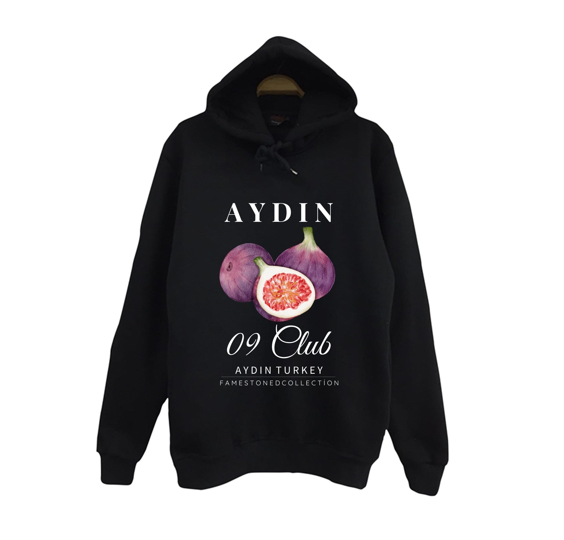 Aydın 09 - İncir - Meyve - Sahil - Beach Şehir Baskılı Unisex %100 Pamuk Kapüşonlu Siyah Sweatshirt