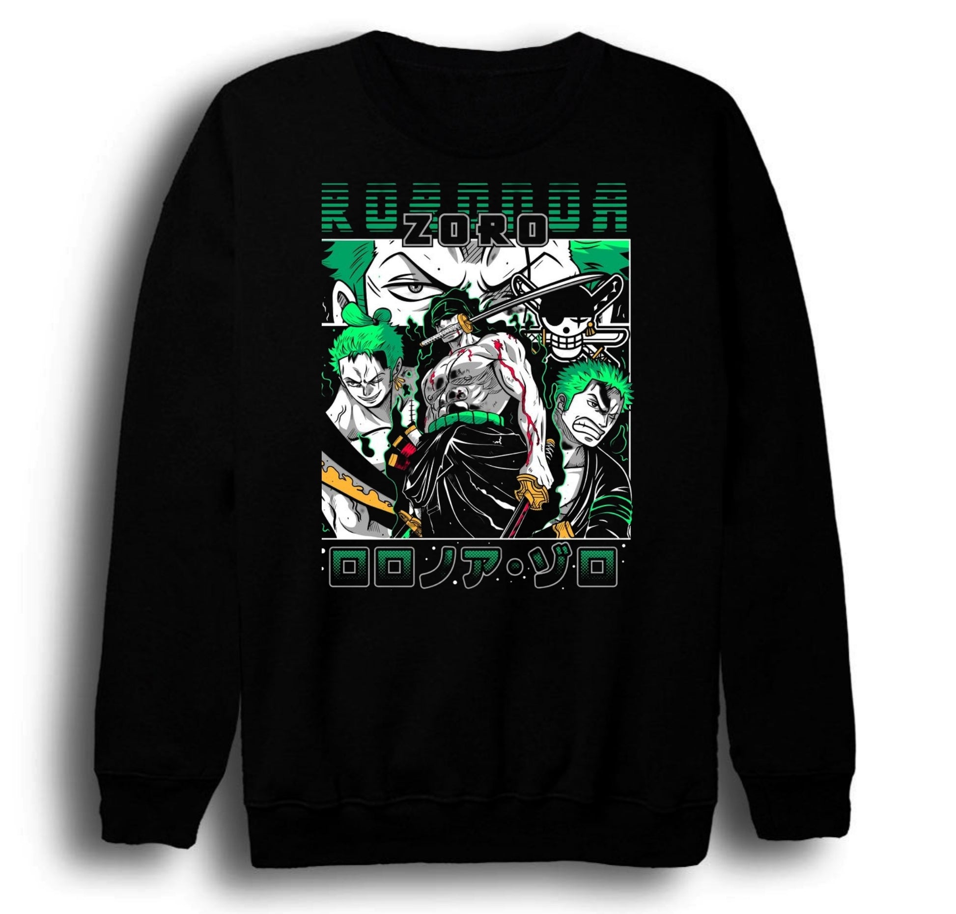 - One Piece hayranları için özel tasarım: Ronoa Zoro karakteriyle süslenmiş, anime tutkunlarının beğenisine sunulan siyah sweatshirt. - %100 pamuklu kumaş yapısı ile gün boyu konfor sağlar ve cildinize nefes aldırır. - Unisex tasarımı sayesinde hem erkekler hem de kadınlar tarafından rahatlıkla tercih edilebilir. - Bisiklet yaka kesimiyle modern ve şık bir görünüm sunar. - Siyah rengi, kolay kombinlenebilirlik ve zamansız bir stil oluşturma imkanı tanır.