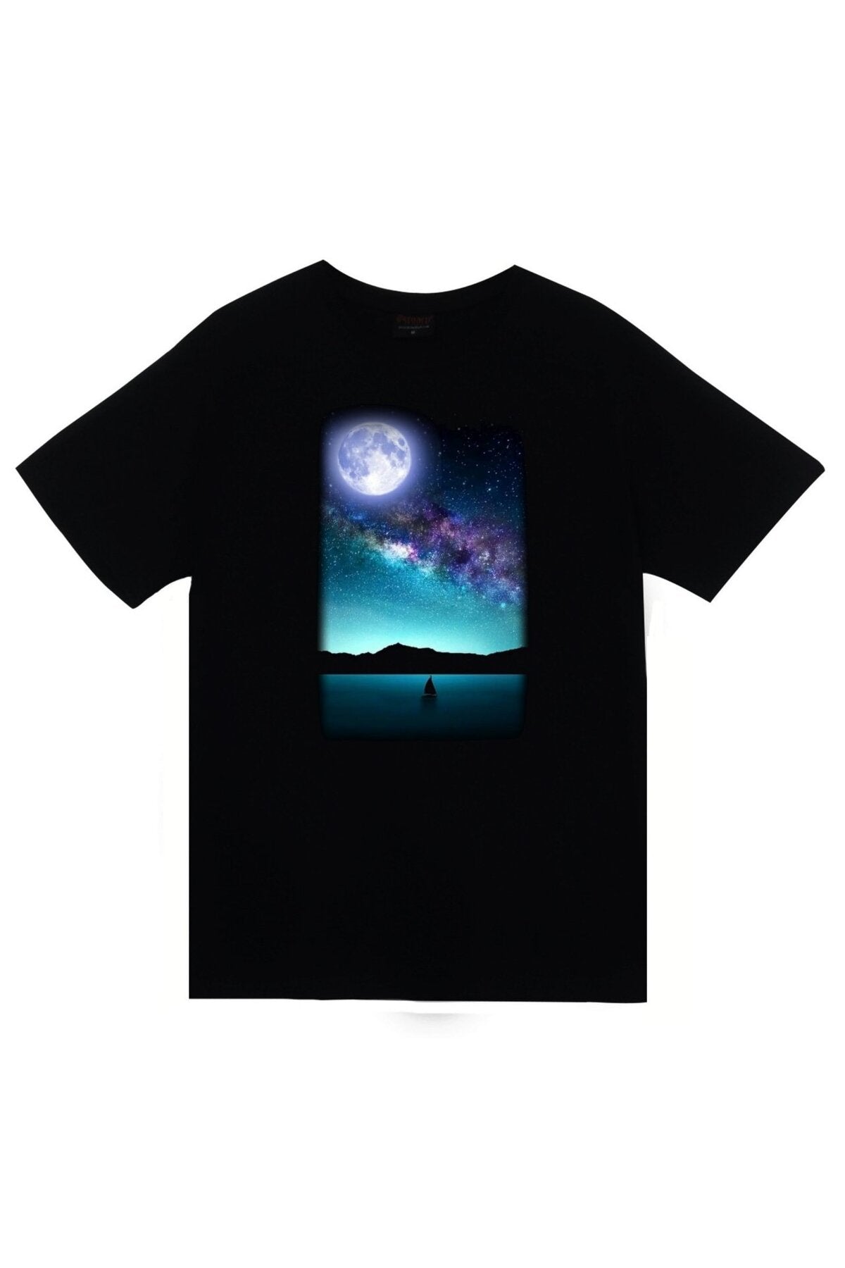 Unisex Siyah Gemi Ay Deniz Galaksi Tişört